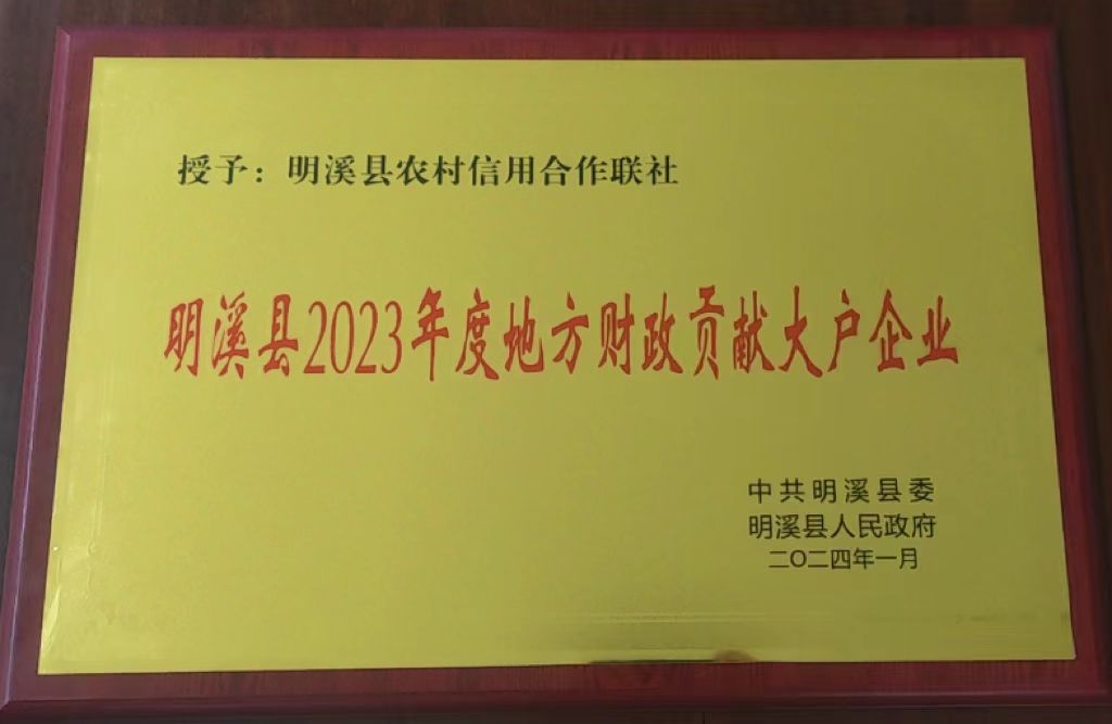 明溪农信联社获评“2023年度地方财政贡献大户企业”荣誉称号