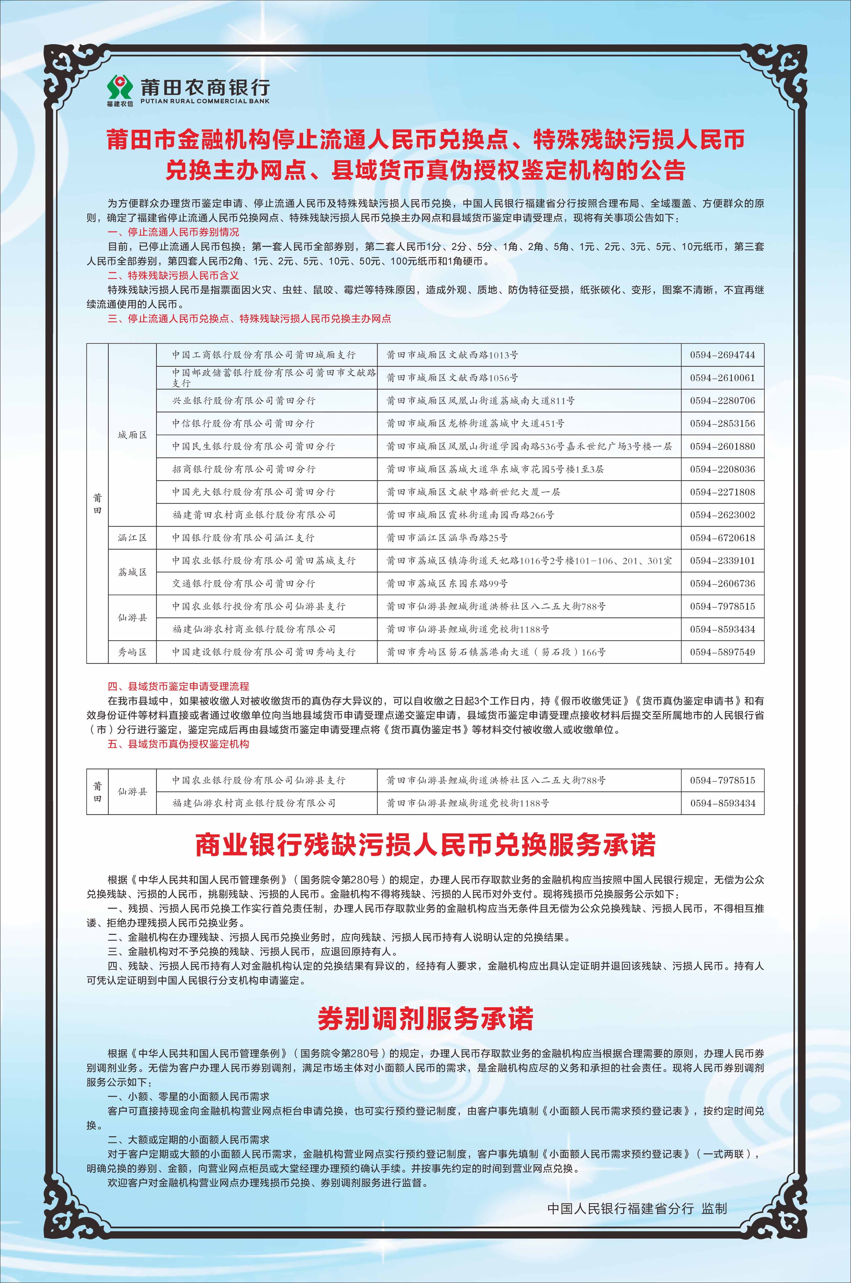 莆田市金融机构停止流通人民币兑换点、特殊残缺污损人民币兑换主办网点、县域货币真伪授权鉴定机构的公告