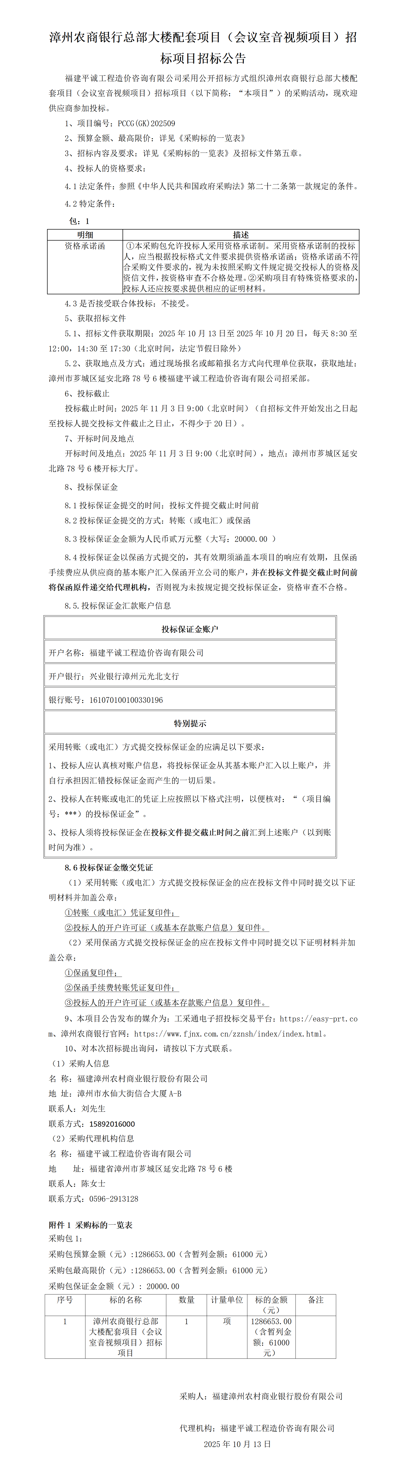 漳州农商银行总部大楼配套项目(会议室音视频项目)招标项目招标公告